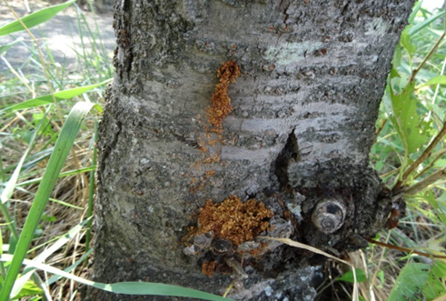 クビアカツヤカミキリの幼虫は、サクラ、モモ、ウメなど主にバラ科の樹木を食い荒らし、樹木の幹や根からフラス(木くずおよびフンなどの混合物)を大量に排出します。