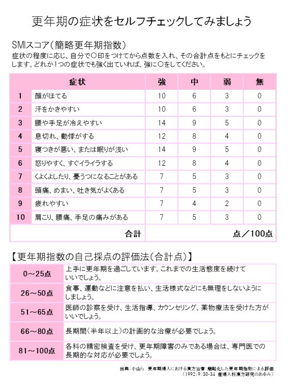 女性の更年期症状の状況を示す一つの指標としてSMIスコア(簡略更年期指数)があります。このスコアは、更年期に現れやすい「こころ」と「体」の変化を簡単な質問で点数化し、体調の変化に気づき、必要な相談や受診につなげるためのチェックシートです。